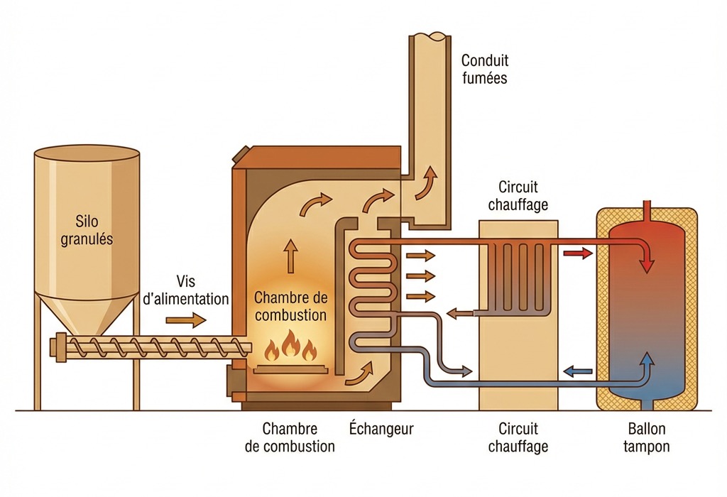 Granulés : automatique, confort maximal. Bûches : moins cher, rechargement manuel quotidien.