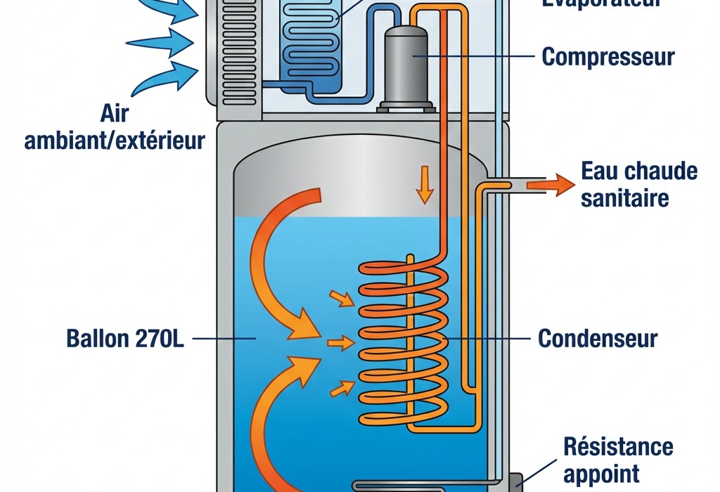 Le système capte les calories de l'air (thermodynamique) ou du soleil (solaire) pour chauffer l'eau sanitaire. Cette technologie consomme 3 à 4 fois moins d'énergie qu'un chauffe-eau électrique classique.