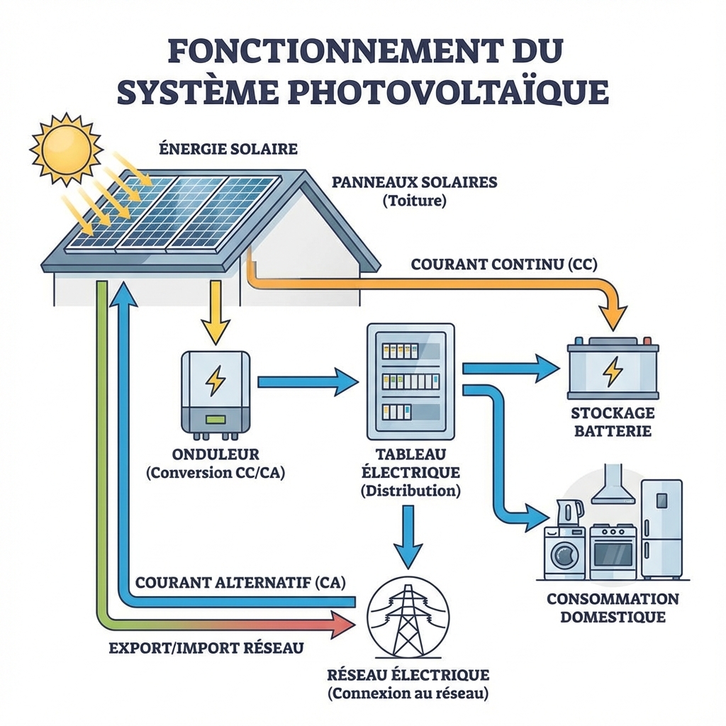 La nuit, vous consommez l'électricité du réseau classique. Par temps nuageux, les panneaux produisent 10-25% de leur capacité maximale. Une batterie (optionnelle) permet de stocker le surplus pour la nuit.