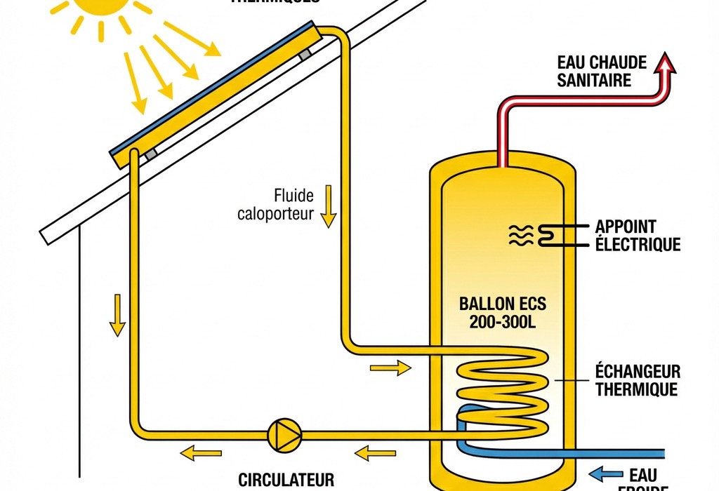 Le chauffe-eau solaire produit votre eau chaude gratuitement. Couvre 50-70% des besoins annuels.