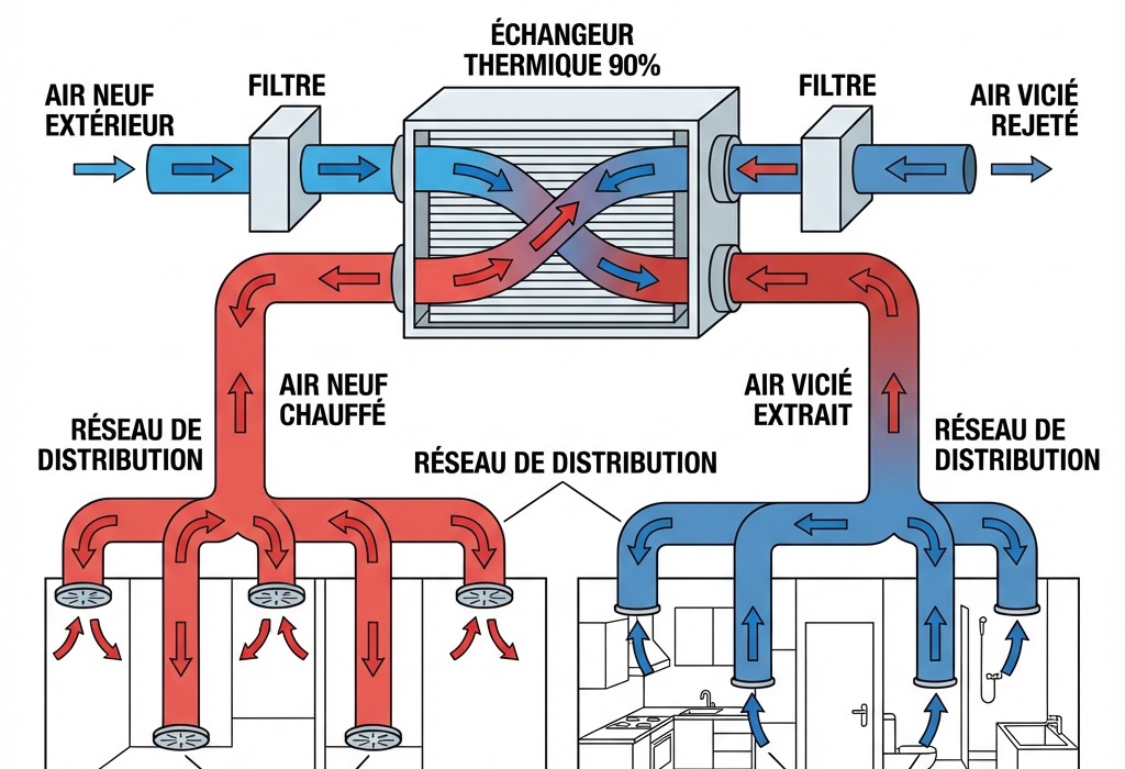 La VMC double flux récupère jusqu'à 90% de la chaleur de l'air vicié extrait pour préchauffer l'air neuf entrant. Ce système assure une ventilation optimale tout en limitant les pertes thermiques.